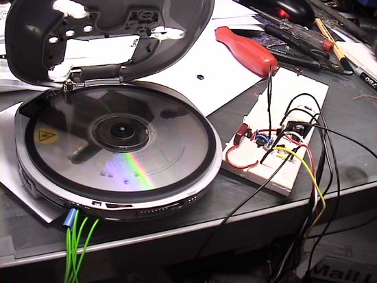 First thing was to rebuild the circuit on a breadboard and modify the CD player with some sensor for the positioning system of the imager (The disc is a transparent CD actually, the other half will be painted red-green-blue for color display):