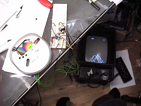 Btw. the reason you see the picture twice in the picture above was explained above: the Vectrex draws two pictures alternating in the disc spinning frequency. If you watch the Vectrex through one hole only with the camera you will only see one picture (the one for the corresponding eye ):